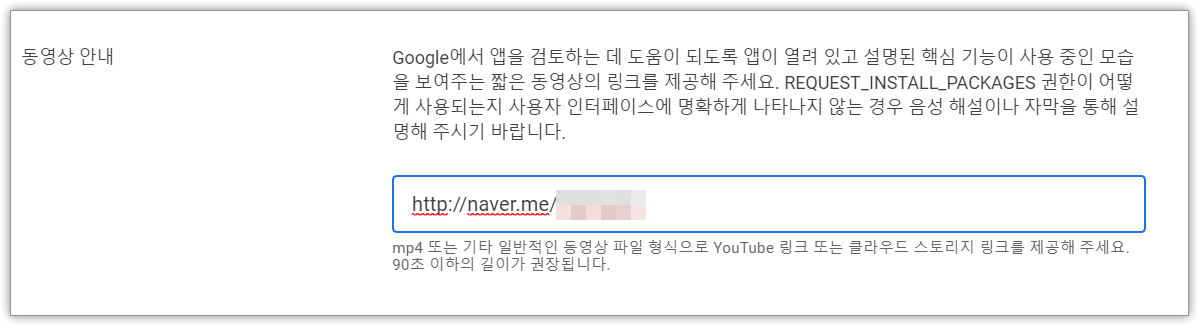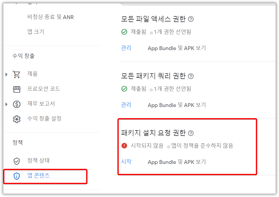 [Google 개발자 콘솔 > 앱 콘텐츠 > 패키지 설치 요청 권한 > 시작] 메뉴를 통해 권한 선언 인터페이스 실행