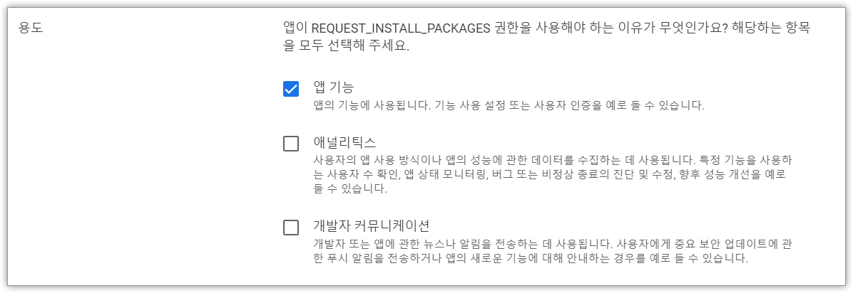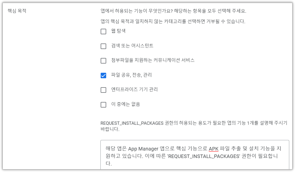 - 앱의 핵심 기능 선택 ('REQUEST_INSTALL_PACKAGES' 권한이 필요한 용도를 선택하면 된다.)