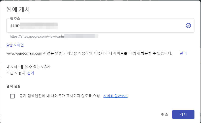 2.3. web url 에 사용할 텍스트 입력 후 [게시] 클릭