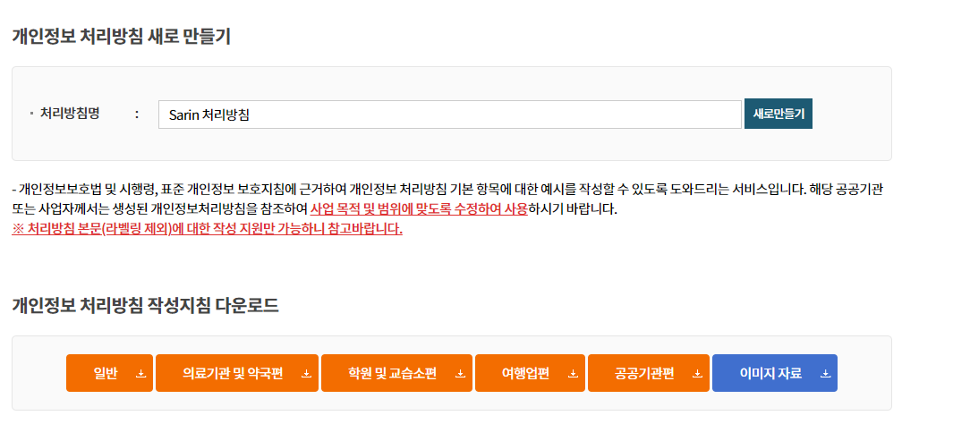 1.1. 개인정보 처리방침 사이트에서 "개인정보 처리방침만들기" 클릭